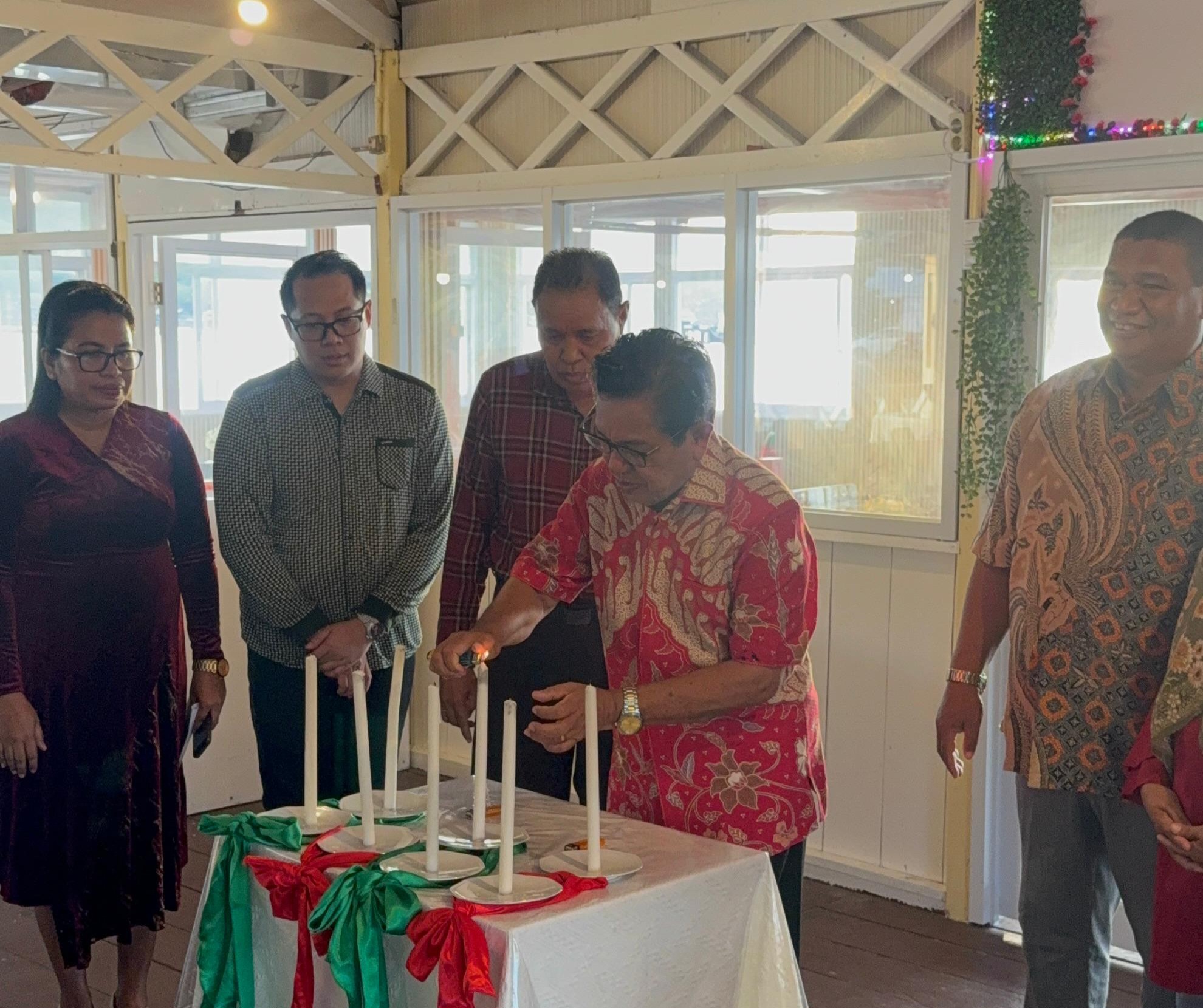 One of the symbolic highlights of the worship service was the candle-lighting procession, which represented light, hope, and unity. This procession was participated in by the Head of the Doctoral Program (S3) in Educational Administration, Prof. Dr. R. Kempa; the Head of the Master’s Program (S2) in Educational Management, Dr. Paul Arjanto; the Head of the Undergraduate Program (S1) in Educational Administration, Vando Makaruku; leaders of the Communication and Alumni Forums; as well as the Chair of the Organizing Committee, Liza Loupatty.