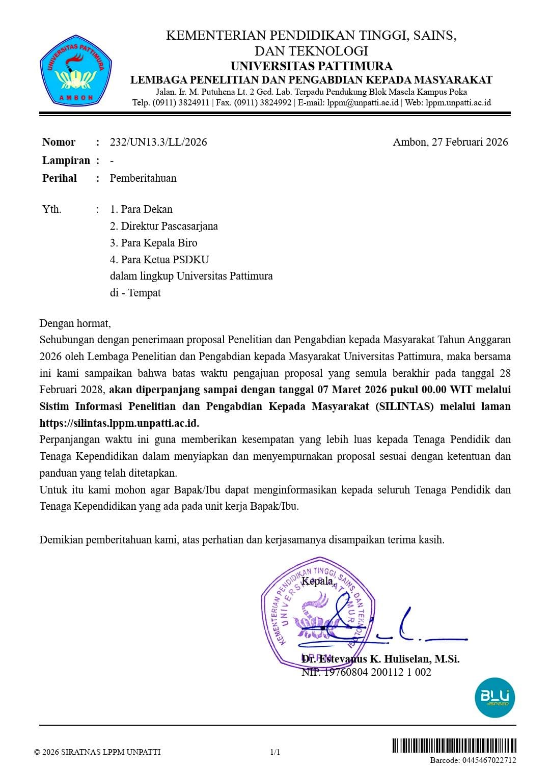Ambon — Universitas Pattimura, through the Lembaga Penelitian dan Pengabdian kepada Masyarakat Universitas Pattimura (LPPM), has officially announced an extension of the deadline for submitting Research and Community Service proposals for the 2026 Fiscal Year. Based on an official notice dated February 27, 2026, the submission deadline, which was originally set to end on February 28, has been extended until March 7, 2026, at 00:00 WIT through the Research and Community Service Information System (SILINTAS). This policy aims to provide broader opportunities for lecturers and educational staff within the university to prepare and refine their research and community service proposals in accordance with the established guidelines and regulations. 📄🎓