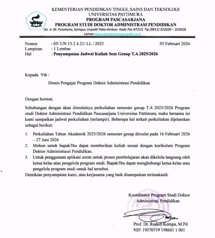 Even Semester 2025/2026 Lectures of the Doctoral Program in Educational Administration at Pattimura University Officially Commence