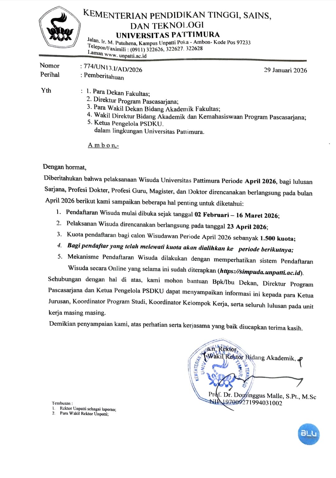 Ambon — Pattimura University (Unpatti) Ambon has announced plans to hold its April 2026 Graduation Ceremony for graduates of Bachelor’s, Medical Profession, Teacher Profession, Master’s, and Doctoral programs. The information was conveyed through an official notification letter issued by the Vice Rector for Academic Affairs of Pattimura University dated January 29, 2026.